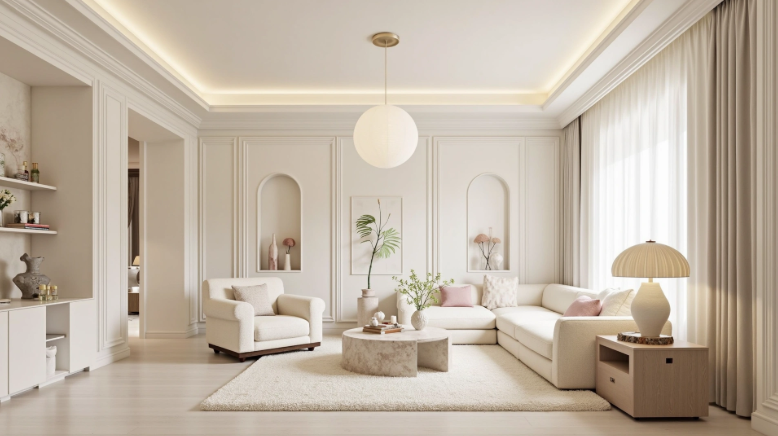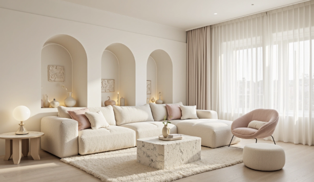 This living room uses a unified creamy white tone as its base, paired with archway designs and rounded soft furnishings, creating a gentle and tranquil overall atmosphere.