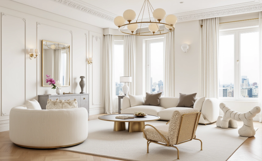 This living room features a modern French style, with pure white wainscoting as the base, complemented by light-colored soft furnishings and metallic elements. It retains the elegant sophistication of French style while incorporating the simplicity and relaxed feel of modern design.