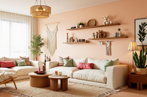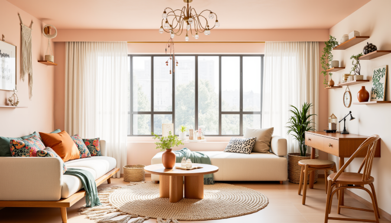 Pale pink walls have become a popular trend in home design in recent years. This modern living room uses gentle pale pink walls as a base, adorned with woven tapestries and unique decorative paintings. The warm tones of the wooden furniture, the ethnic patterns on the sofa cushions, and the accents of a vintage chandelier and rattan storage baskets create a relaxed and cozy atmosphere.
