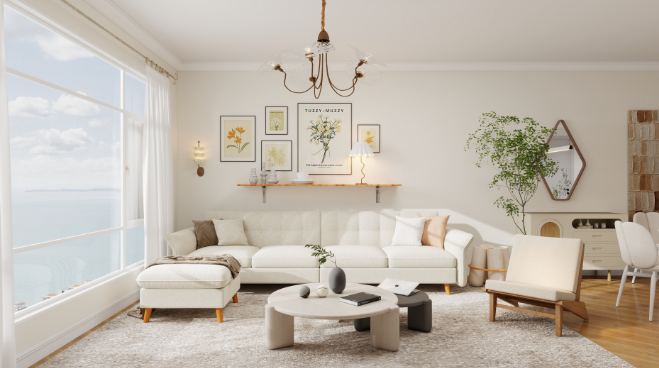 Small ornaments are placed on the wall shelves, and wall lamps and green plants add warmth. Combined with the expansive view from the sea-view windows, the living room retains the soft elegance and romance of the French style while also offering the comfortable relaxation of a seaside home.