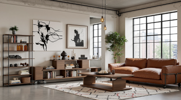 The exposed pipes and large black-framed windows reinforce the industrial tone, while the softness of the leather sofa and the warmth of the log furniture soften the space. Black and white art prints enhance the artistic atmosphere, while metal shelving and glass ornaments combine practicality with an industrial feel. Large green plants, black-framed large windows, and ethnic-style carpets add a sense of relaxation.